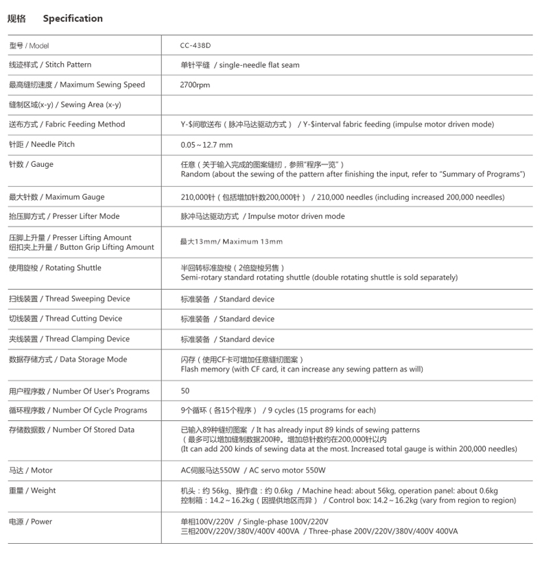转速为2,700rpm 缝制范围最大6.4~6.4 mm 压脚上升最大13mm 半回转标准旋梭 已输入49种缝纫图案